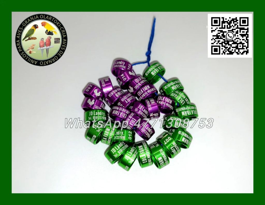 Anillos para Gallo Miniatura GRABADO LÁSER. ( Morado y Verde Espejo letra Blanca).